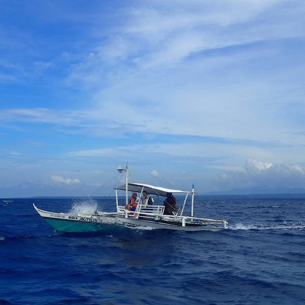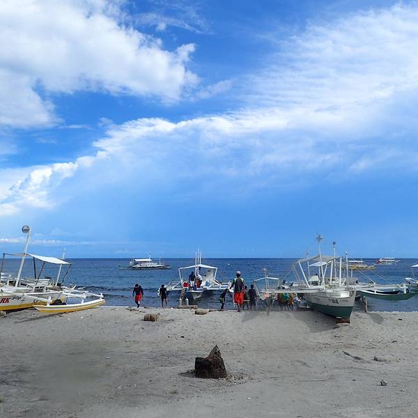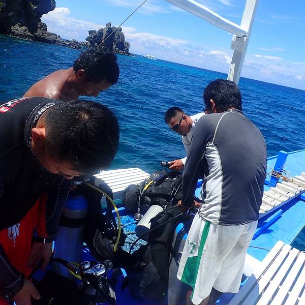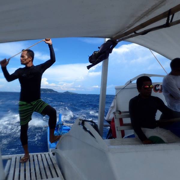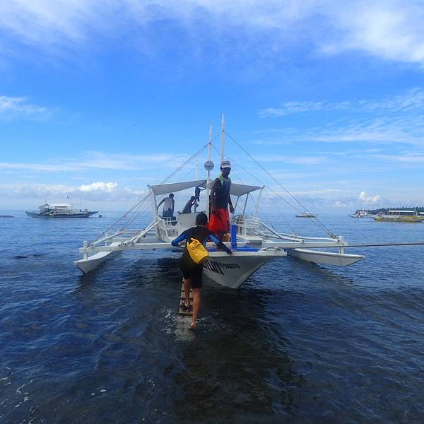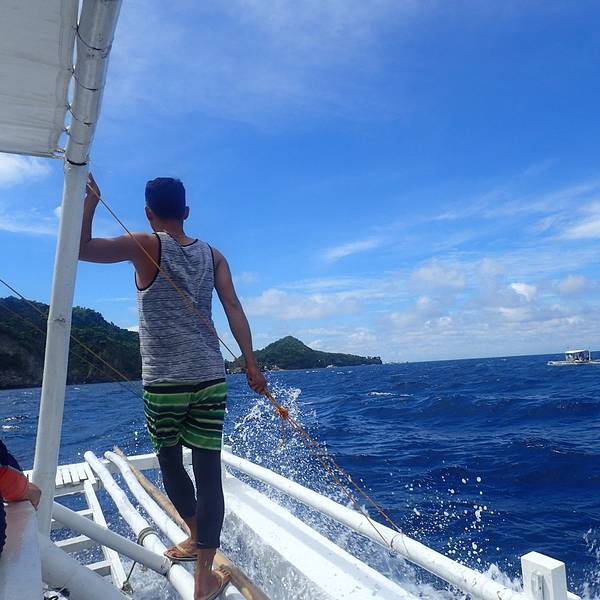 道因 的码头,停靠着 菲律宾 特色的螃蟹船↓这是我们的船,教练大出血四个人包了一艘大船船上的小黑↓到达apo岛~