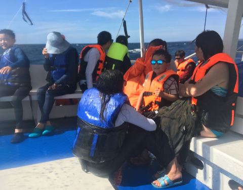 潜水中途在船上休息的时候,会有岛上的人划着小船到我们的船上来售卖当地的纪念T恤,约200P一件。潜水教练也很友善,每一潜上来,教练还会提供面包和当地的面包酱给我们补充能量。