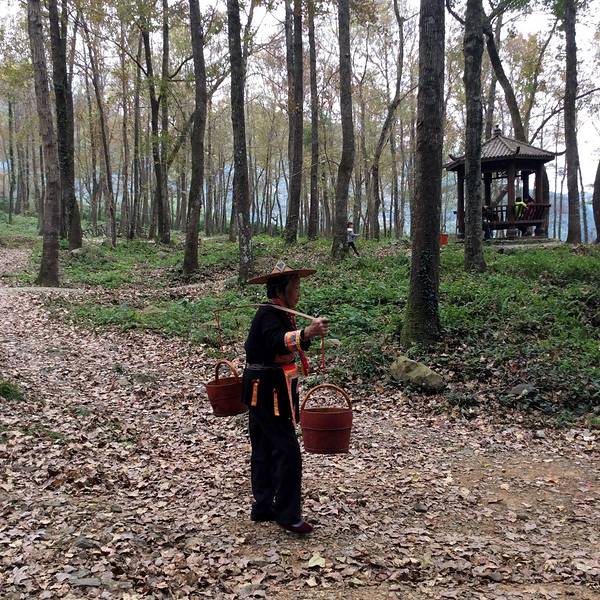 这不就是杨家溪供游客们看看的一小片地吗?收18元门票,前面是频繁出镜的一排老榕树,后面的小树林大约就是枫树了,不过冬季都秃了。图四是山上的桔园,一般游客也不过去。榕树下老人牵牛加上生烟是付费演出,下雨天没活儿,于是牛可以歇歇,生烟的大妈忙着招呼大家带上斗笠背上背篓拍照,当然道具也是要钱的。现在还有赶鸭赶鹅赶鸡表演,付款后均有“专业”人士出演。