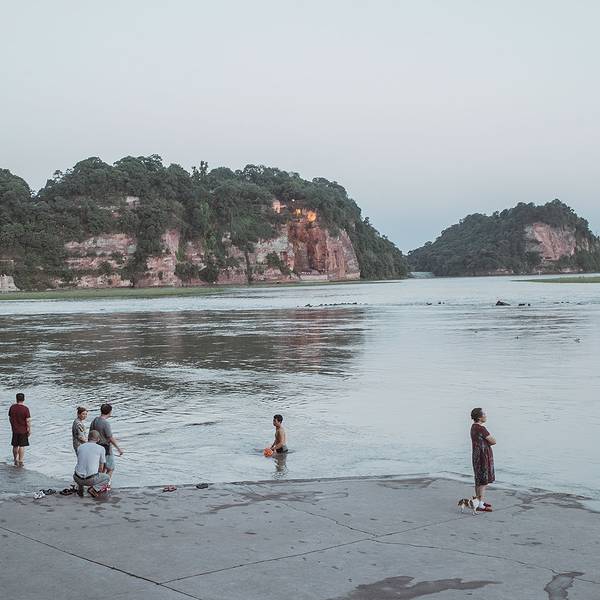 码头不远处是乐山市民喜闻乐见的“天然泳池”,每天早晚都有人在这里健身游泳。最妙的地方是,这条河水流很急,在河里游泳有种“跑步机”的感觉,一直在游,也一直在原地。 拍摄时间:8:00—20:00 拍摄推荐:四星f/8 1/2000 ISO:500f/8 1/50 ISO:1250前景是乐山市民的日常,背景是震撼世界的文化遗址。直接沐浴更衣礼佛了f/6.3 1/100 ISO:100