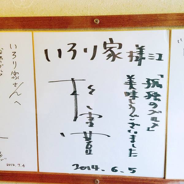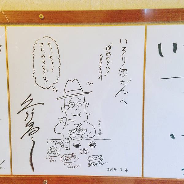 《孤独的美食家》里,五郎大叔吃牛排盖饭的店叫做“地炉家”。看过这一集的小伙伴应该知道,这家店隐匿在非常僻静的山间民居里,五郎大叔找这家店的时候都是走走绕绕,颇费周折。不过呢,想要来巡礼的小伙伴也不必担心找不到路,紧抱google maps的大腿,输入店名就可以了。我们跟着导航一路上坡下坡,终于找到了“地炉家”。“地炉家“是一家很小的家庭式居酒屋,位子很少,每天中午限量提供35份牛排盖饭和15份鲍鱼盖饭,想吃的要早点来。在这个预约单上写好你的名字和想吃的盖饭数量,就等着服务员叫号了。别看一共就这么些客人,等轮到我们的时候,已经过去一个小时了。地炉家就是这样一家小小的居酒屋,一共十来个位子。叔的海报五郎大叔在这集里吃的招牌牛排盖饭采用的是神奈川县的足柄牛肉,每天都是现点现做,食材绝对新鲜。在位子上坐好,牛排盖饭很快就上桌了。和电视剧里的一模一样。新鲜牛排肉烤出来的成品绝对的肉汁满满,五六成的熟度是品尝牛肉肉质的最佳时机。必须要说的就是盖饭上附赠的新鲜山葵泥。 国内小伙伴提到芥末,马上想到的就是那种牙膏状的呛辣膏体,那是便宜的辣根制成的。实际上高级料理店用的都是比较贵的山葵,新鲜山葵泥既保留了它最独特的滋味,又不会过犹不及,变得刺鼻无比。 用筷子取一点抹在牛排肉上,更增加牛排的美妙滋味,我第一口就被惊艳到了,然后心想以前吃过的所谓芥末都是些什么鬼? 定食里还附赠了一个温泉蛋,吃到一半拌进米饭里吃,简直让嗜肉之人醉心于每一块牛排肉配米饭的绝妙滋味。亲身体验才知道,五郎大叔在这一集里绝对不是做效果,是真的好吃!结完帐,服务员送我们出门之前示意我这里有白吃作者久住昌之和五郎大叔松重丰的签名,可以拍照。地炉家巡礼圆满结束。这真的是一家值得一吃的日本餐厅,如果你来箱根玩,时间允许的话一定要来! 来地炉家要事先查好店家哪天休息,不然可能扑个空。
