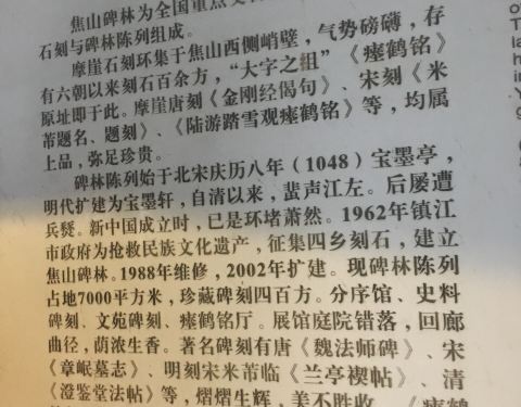 虽然对于碑文化我是完全不懂的,但是从那些简单介绍不难看出焦山碑林所存碑的文物价值虽然对于碑文化我是完全不懂的,但是从那些简单介绍不难看出焦山碑林所存碑的文物价值。跨越的年代久远,碑文档次之高,在碑林界应该是有举足轻重地位的,相信喜欢的热闹一定不会错过。