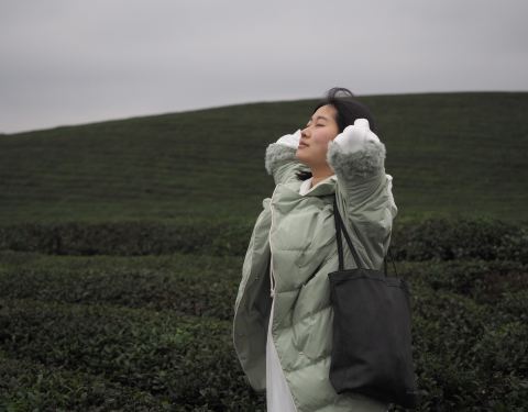 随后下楼沿着观景道走入茶海中,融入绿色的景色中,把个摘茶的姿势留个影