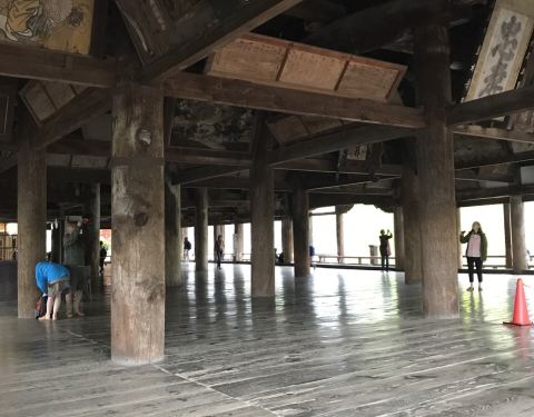 广岛的千叠阁,脱下鞋子装进门口自取的拎袋里,踏在光滑干净的木头地板上。据介绍,这本是丰臣秀吉为祭奠战殁将士亡灵而建造的大经堂,面积相当于857张“叠”(榻榻米)大小,被称作千叠阁,是宫岛最大建筑。江户时代曾作为交流和纳凉的场所受到人们的喜爱,所以大柱子上记录着当时的歌舞伎演员一行的名字、川柳等!我在千叠阁最外围的殿阶上坐下,背靠粗壮的木柱,分不清方向,睡着了。