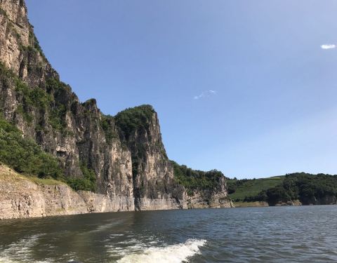 从长白山回沈阳的路上 搜到了这个景点 门票一人50 一车5元 进大门就是一条两侧笔直树木的路 很漂亮 林荫小道忍不住下车去拍照 途经一个小村落(很奇怪这个景区要穿过一个村子) 走到尽头就是一个码头 下面有游船还有快艇 我们4个人包了个快艇150元 真的很棒哦 看着两侧的山 真不愧东北小漓江的称号 尤其快艇司机给我们来360大回环 真的不要太过瘾 唯独景区有点小 项目单调 如果再开发一下 一定会更好
