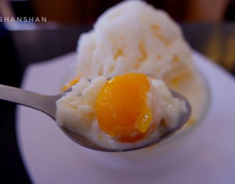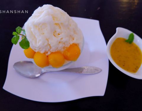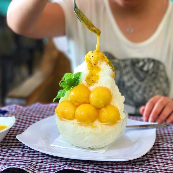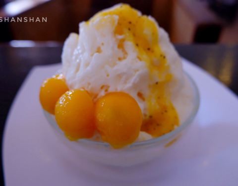 白白的底是香草冰淇淋刨冰,淋上百香果酱真的又好看又好吃