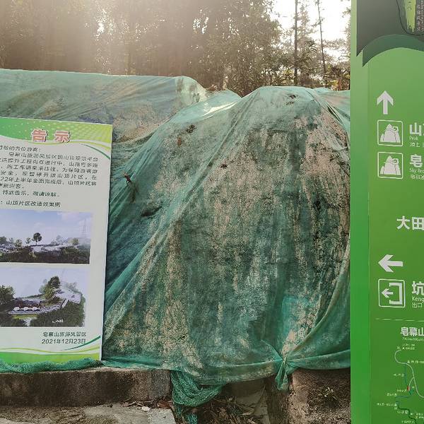 作为佛山第一峰,其在登山爱好者心中还是有一定地位的。这次趁元旦假期,将其选为新年的首次登山运动。瀑布推荐从坑美村入口进入。记得第一次过来的时候,开车需要从村中穿过,如今新修了一条柏油马路,虽然只有双向两车道,但路面平整,青山环抱,开起来非常舒服。景区门口的停车场较少,但景区附近辟有大片空地,虽然路面不太平整,需要步行较远的距离,好在是不收费。 景区重新开放后,目前暂不收取门票,记得以前的门票是15元。进入景区后,游览路线简单,就是一条登山线路,前一段是山脚下的休闲景区,这里有竹林瀑布,环境清幽,空气中负离子含量高,是天然大氧吧。山泉小溪竹海接下来的登山石阶,是佛山地区最长的登山步道,号称佛山第一梯,全长2.4公里,共有6666级台阶。不过台阶相对平缓,爬起来并不太费力,沿途新修建了很多亭子,累了可以在此稍做休息。登山石阶佛山第一梯不过可惜的是,目前也只能爬到大概4000多级,山顶片区依然处在维修状态,根据上面的公告,预计要到2022年下半年才能对外开放。所以,这次过来,依然未能弥补未能登顶的遗憾。山顶区域封闭皂幕山森林公园,位于崇山峻岭之中,对于佛山来说,确是一处难得的旅游胜地。景区内不仅可登高望远,挑战自己的体力,也可在密林中漫步,与大自然来一次亲密接触。登高远眺这里民风淳朴,登山之余,可寻一处农家乐,品尝一下当地的美食。烹饪方法可能不太精致,但食材绝对新鲜。闲坐于青山绿水之间,品一杯农家的粗茶,苦涩中透着一丝清甜,在鸟语花香中饱餐一顿,就这样度过闲适的一天。农家美食