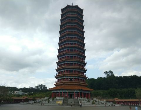 在澄迈县城里的一处小山坡上,游人可以免费参观,登上高高的台阶,迈入大门可以看见一个很大的广场及一座巨大的宝塔,在广场上可以俯瞰澄迈县城,宝塔可以登顶,里面有电梯,但收费50元/人。
