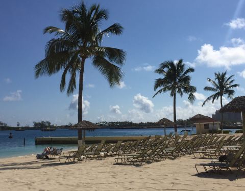 距离拿骚的国际邮轮码头不算太远,整体的环境还是可以的。可能靠近市区,这里的棕榈树排列和修剪都比较整齐,但是海滩的宽度却不是很大。旁边有几个小棚子可以售卖当地特色的饮料解渴,还能眺望整齐的游轮停港