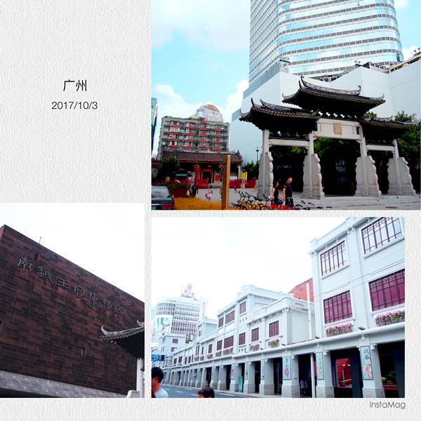 扔了行李,接下来解决温饱问题,大众点评找了一下附近的饭店,找到一家点都德,发现可以线上排队,于是定定心心拿个号,走去吃饭。 广州十月,天还是很闷热。 一路逛到酒楼附近,发现一处小小城隍庙矗立在玻璃幕墙下,左边则是一排崭新的骑楼,端是一副新旧融合的老广风味。骑楼 [qí lóu]是指建筑物底层沿街面后退且留出公共人行空间的建筑物,是一种近代商住建筑,在两广、福建、海南等地曾经是城镇的主要建筑形式。 这种欧陆建筑与东南亚地域特点相结合的一种建筑形式可以挡避风雨侵袭,挡避炎阳照射,造成凉爽环境,因此在东南亚十分风靡,随后也传入华南地区。骑楼是我国广东,海南,广西,福建等沿海侨乡特有的南洋风情建筑,都是当年华侨从东南亚返乡所建。看着大众点评的排号进度差不多了,紧赶慢赶地去了点都德。然后被人山人海的排队食客吓到了,大概是两年前大众点评排队还不普及吧,大家都还没有意识到可以在APP上排队。。。餐厅很大、翻桌极快,不到五分钟就叫到我们的号,其实从拿号到排上也快1小时了,但物理上我们几乎刚到酒楼就吃上了,于是在一众老饕的注目礼下入座开吃。 点的有点多,味道还不错,比无锡本地最好的粤菜水准还要高一些,但也算不上惊艳吧,唯一还有些印象的是金钱肚挺好吃的~