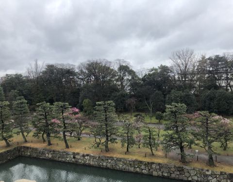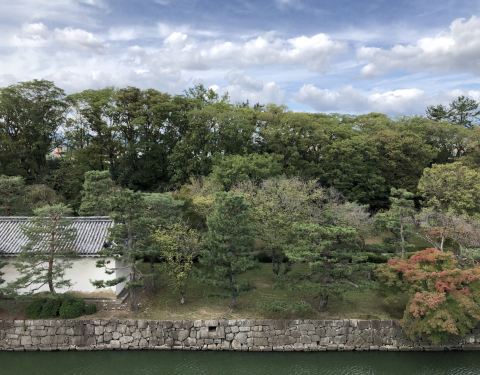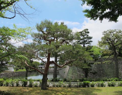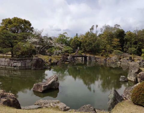 二之丸庭院为一回游式水庭院,水庭的周边植有高低错落、组合有致的各类植物,水面、树木和湖石等相映成趣,颇有青绿山水的味道。此外二条城的樱花也是闻名京都,八重樱花可谓是樱花中的王者。