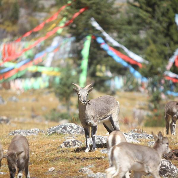 背依神山,面对圣湖的措普寺,似汇集了天地灵气,昭示着虔诚的信仰,寄托着美好的祝愿。作为典型的藏式建筑,措普寺外观庄重古朴又气势恢宏,金色的屋顶在阳光下熠熠生辉,四周经幡随风飘扬。僧尼和周围的野生动物长年和谐相处,下午时分,经常能看到藏马鸡、岩羊等来到寺庙大院内嬉戏觅食。被牧民长年喂养的土拨鼠,总是忍不住探头“观察人类“,显得格外憨态可掬。