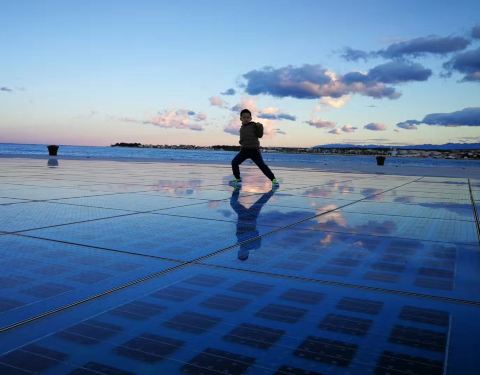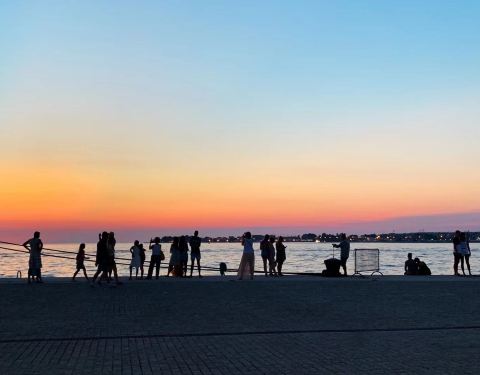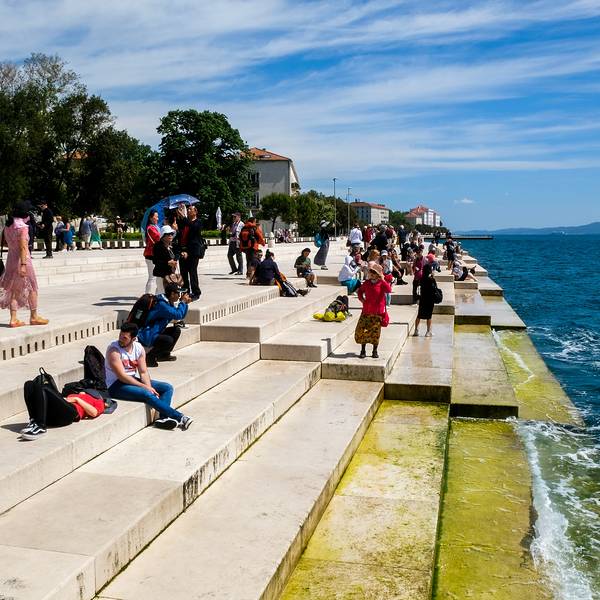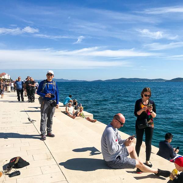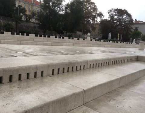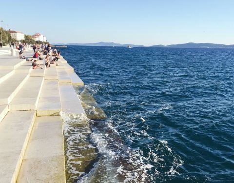 海边的大理石台阶便是海风琴,通过风琴的原理, 白色石阶下暗藏35个大型风琴管,大海就是风箱。利用海水的冲击,在风琴管中自动形成气压变化,发出如教堂管风琴般浑厚的回响,真的是有创意。而他的设计师尼古拉•巴希奇也因此获得 the European Prize for Urban Public Space 2006年度大奖 。 海风琴最美的是看日落。黄昏时分,海边坐满了人!伴随着迎面吹拂的海风,耳边是此起彼伏的风琴声,还真是特别的享受!当太阳降落至海平面以下,所有人都非常有默契地一起鼓掌,感谢大自然的完美演出!