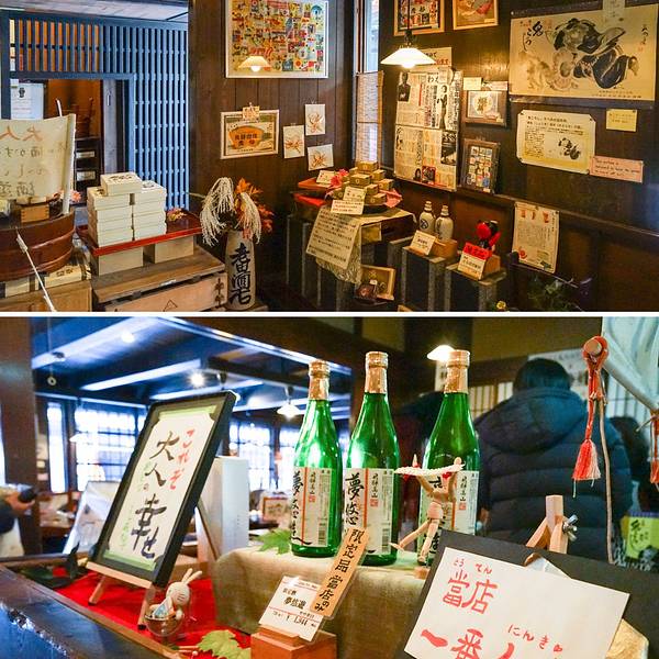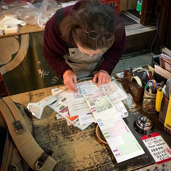 很多人说,去一个地方旅行,最富当地特色的就是他们的市场。当天下着大雪,我们一早来到岐阜县飞弹市的宫川早市看看有什么可以淘回家的。当天的雪真的太大了,很多店铺都还在忙着清理雪堆,否则沿街都是摆出来的小摊,极具当地特色。我们在沿街看到有非常多的卖酒的店铺,导游(嗯,几个人玩于是请了个会说中文的日本人导游)告诉我们说,这里的酒都是自家酿制的,有非常多不同的口味和种类,于是想着给男性朋友带一点,就进去看看。这里真的很适合嗜酒者或男人来逛!各式各样的酒类、瓶子、颜色,女生看到都觉得很兴奋!和我们一起进去的游客买了非常多,如果他也知道用hands-free travel,估计会买的更多~~我和小伙伴都买了不少,但下午还有不少行程,才不想带着他们走一路~于是想让他们帮我们直接运到机场去。因为这个服务在日本中部推广不久,店里的老板也要戴着老花镜帮我们处理。但是过程是非常简单的,递出你的二维码卡,滴,然后对方向你核对姓名和航班信息,交运费,搞定!