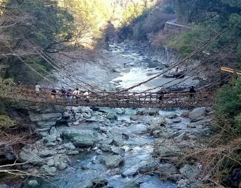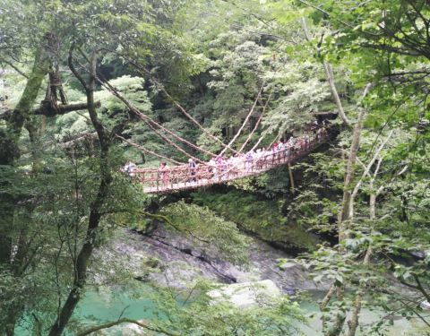 景色相当不错。桥的危险性在于桥底的洞非常大,成年人的脚也可以穿过去。桥下是峡谷,河流比较急蔓桥位于大步危峡谷中。JR大步危峡站下后可乘巴士到达。每年4月到11月班次稍多,其他时候一天只有五班车,要算好时间。 蔓桥其实是一座藤桥,人走在上面会荡来荡去。桥的危险性在于桥底的洞非常大,成年人的脚也...蔓桥位于大步危峡谷中。JR大步危峡站下后可乘巴士到达。每年4月到11月班次稍多,其他时候一天只有五班车,要算好时间。 蔓桥其实是一座藤桥,人走在上面会荡来荡去。桥的危险性在于桥底的洞非常大,成年人的脚也可以穿过去。所以大家走的时候都是拉着桥的栏杆(也是藤做的)走的比较慢。桥下是峡谷,河流比较急。景色相当不错。 是一种比较有趣的体验。 展开