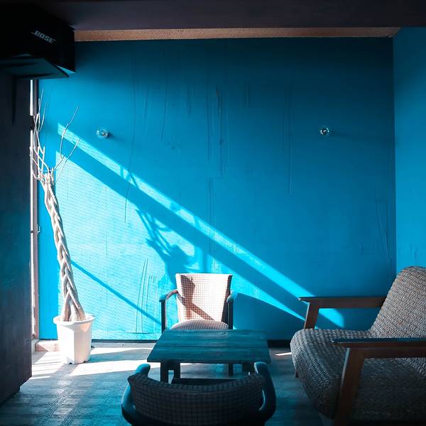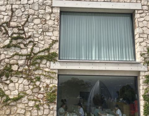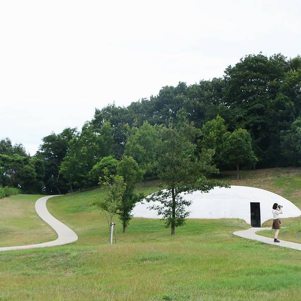 观览豊島美术馆的路线中,你必须绕远路,走过一小段可以远眺濑户内海的小径,才能到门口。虽然美术馆明明就在旁边,但这是建筑师的刻意,刻意让人们看见自然的山林与海洋,艺术将与之共生为一体。这个美术馆,远看上去犹如一滴水。这滴水的旁边,还有更小的一滴水,那是个咖啡馆。