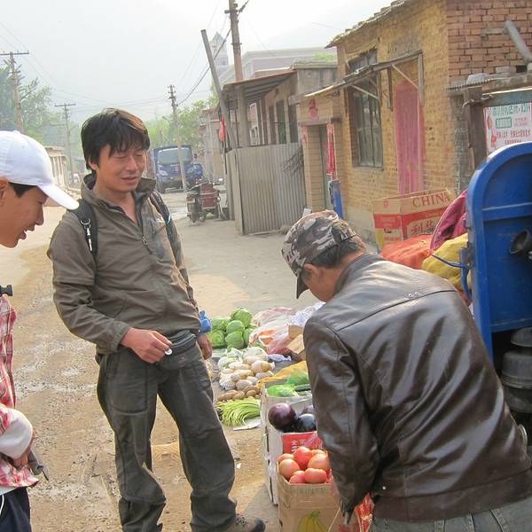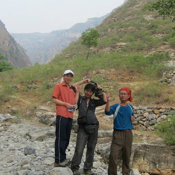 天一亮我们开车把车停在了九渡卫生所附近的不碍事马路边,因为这是从九渡出来之后必经之地,坐公交车到一渡已经早上七点多了,从沈家庵(这儿属于河北省)进入,旁边的餐馆用早餐,买了西红柿准备午餐。8:10分左右,上山之前合影,做英雄状。