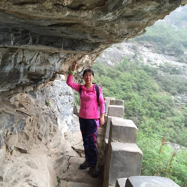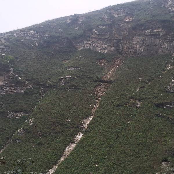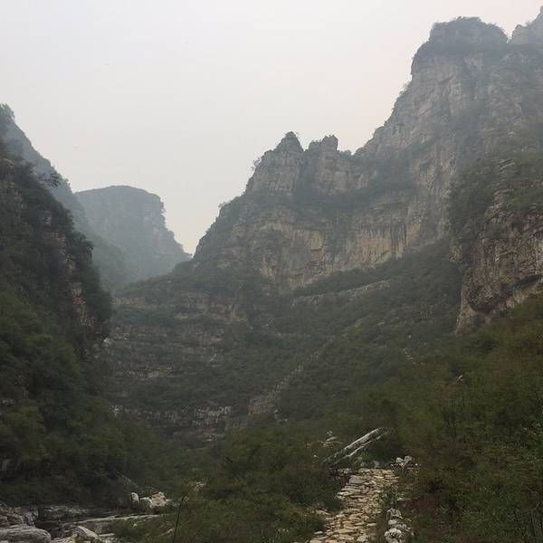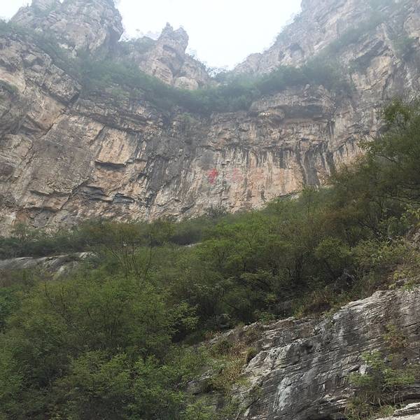 远处悬崖上有四个字。今天能见度不好,雾蒙蒙的,增加了神秘的感觉。 还是决定,走一下,开车到一渡沈家庵