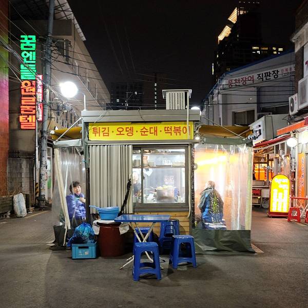 像很多韩国传统市场中的夜宵摊,这里的摊子不大,有的有塑料棚子罩着,有的没有,可以在这里吃到一些韩国的…