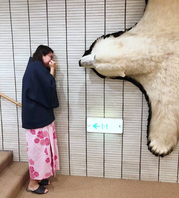 以自由选择是否带早晚餐,含早晚餐2人24000日币左右(1600rmb左右)第二天没加餐9000日币(550rmb左右)划算。吃好饭,泡好汤,穿浴衣出去溜达,酒店提供很多种颜色浴衣供选择,1楼大厅有很大一只熊标本,怕怕哒。