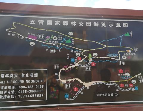 五营红松林海景区地处黑龙江省北段,属于小兴安岭南坡林区。每年的夏秋两季,森林公园内植被茂盛、气温宜人,是旅游时节。五营红松林海景区空气中的负离子含量非常高,来这里一定要慢慢走在木栈道上,吐纳着纯净清爽的空气,享受纯正的森林浴。景区里面经常能看到憨态可掬的松鼠,鼓着腮帮子在吃松果,非常可爱。 从停车场到售票处有些远,还得坐几分钟摆渡车才能到园区门口。公园入口停着一列款式复古的小火车“少奇号”,森林观光小火车的始发站南面是丽丰湖,湖面上有游乐船只。湖西岸建有林区别墅、饭店、旅店、旅游纪念品商店等。 五营红松林海景区内拥有国内数量最多的红松,这些红松四季常青、挺拔葱翠,登上公园内的观涛塔可以俯瞰松涛林海,很是壮观。除此之外,公园内还有倒影着蓝天和树林的天赐湖、流水声清脆悦耳的响水溪、怪石嶙峋的黑瞎岭等景点。森林深处的绿野仙居坐落着一座座小木屋。你还能在原始狩猎工具展区看到以前猎人狩猎、捕捉动物的原始工具。而当你在森林中行进时,一定会不时地遇到觅食的松鼠,野趣十足。 五营红松林海景区面积很大,但里面有固定观光点和步道,通常花3-5小时可以玩下来,如果不想走路景区还有观光车可以坐,非常人性化。当然你也可以在里面待得更久些,多呼吸些清新空气。公园游览线路:公园大门-少奇号-松乡桥-观涛塔-绿野仙居-天赐湖-园中园-响水溪-森林浴-黒瞎岭(可选)-公园出口。