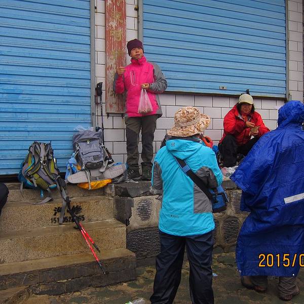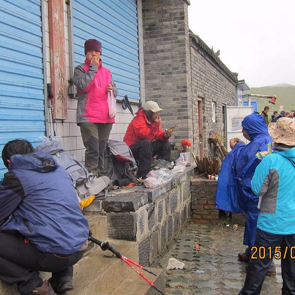 由左到右,12+1(背对门)、腊月姐(红衣站着)、花落(后背)、宁静姐(红衣坐着)、黄山(蓝色雨披)、付老大(雨衣雨裤),在简单早餐。