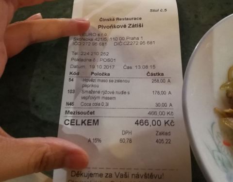 老板是浙江夫妇,不接团餐。我去的时候中午一点,店里中国人和外国客人各一半,点了份炒西兰花和老板推荐的水煮牛肉,菜式中规中矩,在国内就很一般了,但对于吃了一个礼拜西餐的我真是人间美味,老妈说是到欧洲后最好吃的一顿。两个菜24欧的样子,在捷克不贵了。