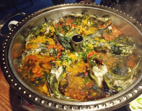 飘香河蚌肉,很特殊的做法,先用蚌壳盛着辣汤放在火上煮开,然后再放入河蚌肉和香菜段,不用一会儿就能做好。河蚌肉弄吃出牛板筋的感觉!很辣!但是很下饭。农家三蒸是三个小瓷方碗装着小虾米、鱼头和广味香肠,都...飘香河蚌肉,很特殊的做法,先用蚌壳盛着辣汤放在火上煮开,然后再放入河蚌肉和香菜段,不用一会儿就能做好。河蚌肉弄吃出牛板筋的感觉!很辣!但是很下饭。农家三蒸是三个小瓷方碗装着小虾米、鱼头和广味香肠,都是搁了豆豉辣椒蒸的,芋头香而软。