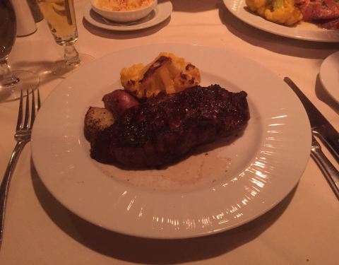 餐厅的气氛不错,酒吧有歌手演唱,非常热闹。我们在餐厅内吃晚餐,服务员主纱介绍各种菜式,点了一份 New York Strip, 要求五成熟,肉质鲜美,估计有12 oz 重。加上沙拉和餐前面包,可以捧着肚子走。