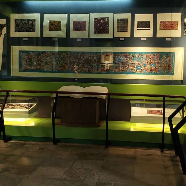 现在院内作为贵州民间艺术的展览向游人开放。敦煌佛女,这件艺术品竟然是蜡染的作品!门口的戏楼