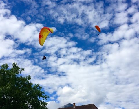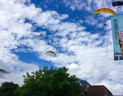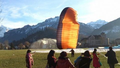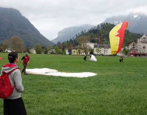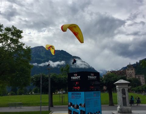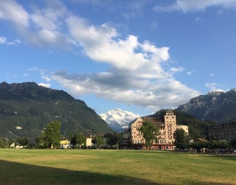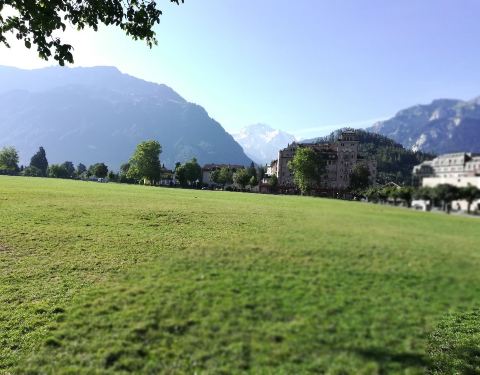 是因特拉肯小镇中心位置的大草坪,天气好的时候,从这里可以直接看到少女峰,绿色的草坪,配上远处洁白的雪山,景色非常震撼,天空中还不是的飘过降落伞。