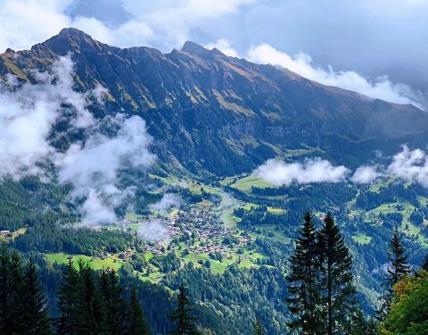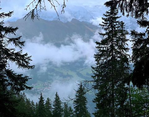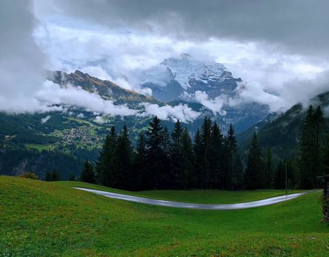 当你坐在草地边上的长椅上时,就可看到美丽的少女峰,草地还是滑翔爱好者的降落地