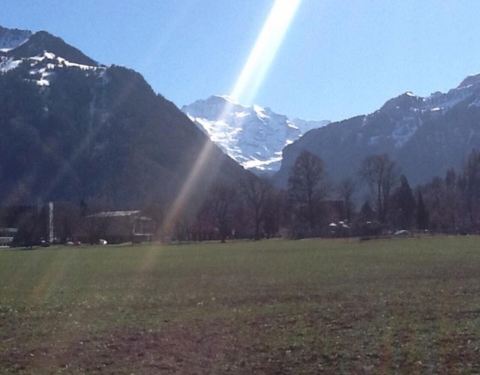 从因特拉肯东出战后,沿着唯一的一条主干道往西走,在左边就是这块大大的绿草坪了,草坪也是滑翔伞的着落点,不时地会有滑翔伞降落,另外往南边远处看就是少女峰了。