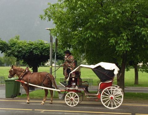 在草地边休息了个把小时,看远处少女峰云雾缭绕,看蓝天白云下五彩缤纷的滑翔伞飞来飞去,充满幻想。静静地欣赏着大街上古马车逍遥自在,绿油油的草坪,花儿点缀其间,美不胜收。
