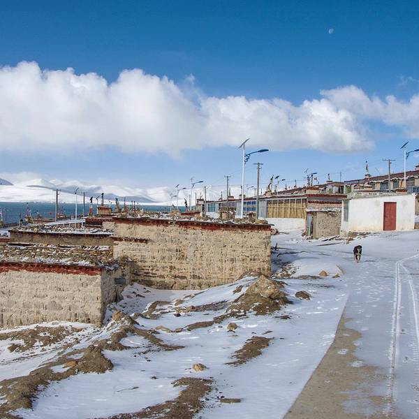 4月16日,昨夜一场雪后,普姆雍措边的推村变了模样,晴空下的推寺庙肯定又会是另一番景象