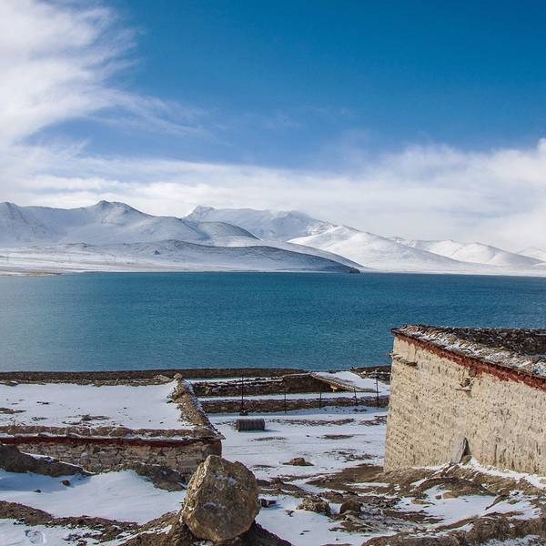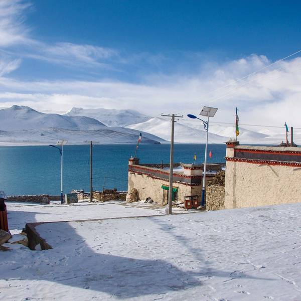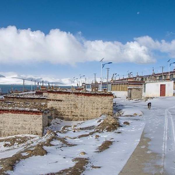 4月16日,昨夜一场雪后,普姆雍措边的推村变了模样,晴空下的推寺庙肯定又会是另一番景象。但我和妻没时间再逗留了,更没胆量再睡一宿了,玩不起了。