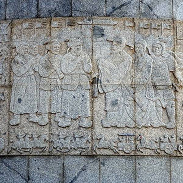 下了城墙过马路去濮阳市著名的“龙碑”景观点。“龙碑”是为纪念濮阳发掘出“中华第一龙”而特设的纪念碑,在街中心的三角地,离很远就能看到了。 龙碑碑身为三椎体,三个面上各镶嵌一组金色大字:中华龙乡、颛顼遗都、帝舜故里。龙碑高12米,分别由8节8吨重的花岗岩砌成。龙碑基座为圆形,直径21米,设8步台阶。 龙碑中座也为圆形,高2米,直径10米,周围镶砌8幅浮雕,分别记述了濮阳历史上的八个重要事件:中华龙源、澶渊之盟、武帝治水、铁丘之战、孔子居卫、启铸九鼎、相土造车、颛顼乘龙。 中华龙源