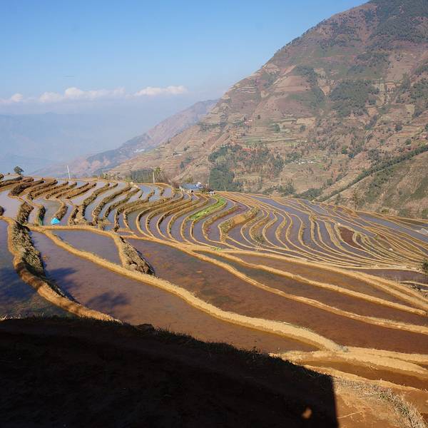 冬天,米易县新山傈僳族村的千亩梯田开始蓄水,为来年栽秧耕种做准备。米易县新山村梯田主要位于莫佬河上游马鹿塘河与白龙洞沟交汇区,面积约1000亩,马鹿塘河、白龙洞河为其主要的水源,四季长流不息。