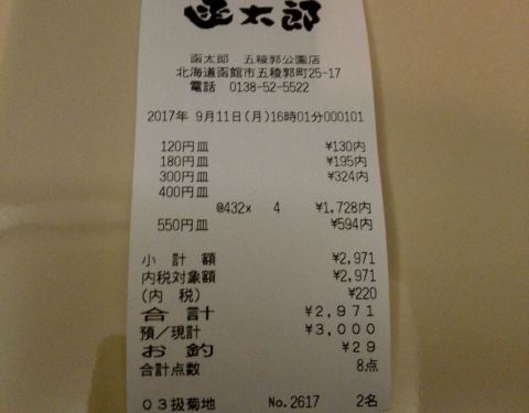 函太郎寿司是家连锁的餐饮店,五棱郭町这家在函馆市很有名气。这里用的原料很新鲜,米饭有嚼劲,吃起来味道很好。店里服务员似乎缺少一点热情,店里卫生干净。价格觉得不便宜。
