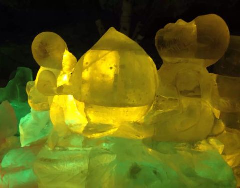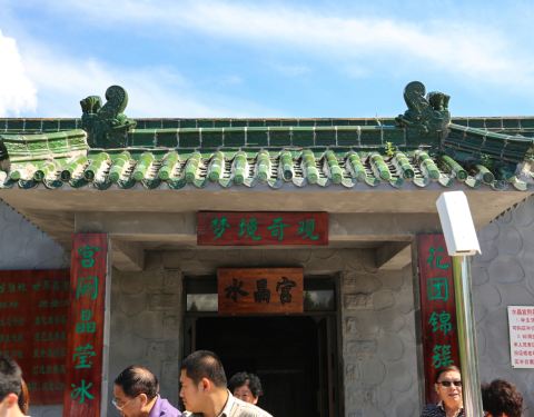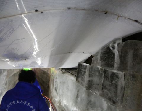 进入51.2万年前形成的水晶宫前,需要租用景区提供的棉衣,以抵御洞内的寒冷。不过,也有帅哥和美女穿着短衣、短裤进入冰洞,展示坚强的体魄。门票30元,老年票半折。 水晶宫(地下冰河)全长150多米,深23米,正面的洞内大厅400平方米,另有两个分支侧洞,洞内最高5米,洞顶为穹窿状,四季平均温度零下5℃。水晶宫洞内的彩色冰雕(古代仕女、城墙,佛像等)反而掩盖地下冰河的真实面貌。