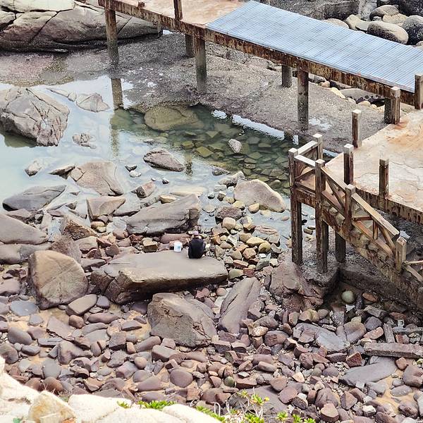 靠近海邊後坐在潮音亭,欣賞海浪拍打岩石的潮音,附近沙灘享受日光浴