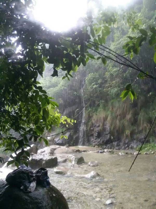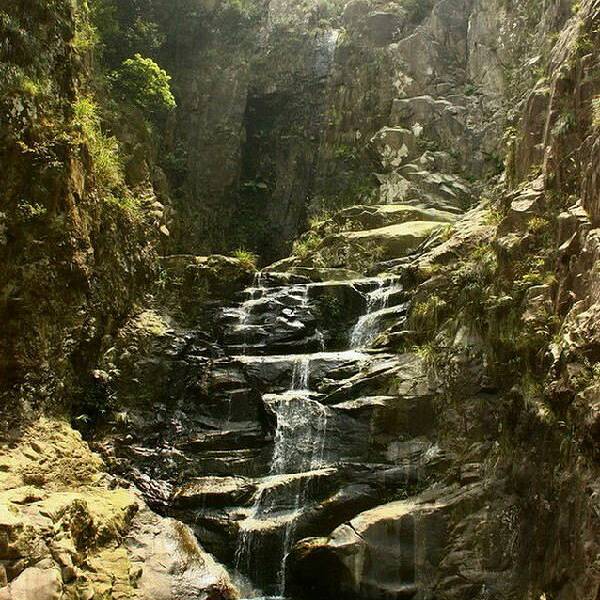 峡谷深处是一处宏伟壮观的瀑布群,瀑布源头海拔高480多米,宽30多米,分三层瀑布,每个瀑布下有一个100M2以上的绿潭,游者可涉险攀至二瀑下,潜入潭中,尽享水中乐趣。整个瀑布群一瀑为100多米,二瀑80多米,三瀑60多米,水量大时,其声如雷,十里可闻,且瀑区经年雾蒸云腾,七彩长虹,凌空南北,非常壮观。