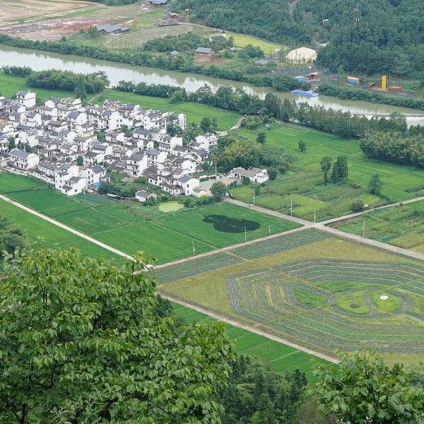 如果是春季油菜花开时应该会更漂亮。眺望山下,可见一太极八卦田和葫芦形水塘。截图放大,旁边的村子叫南坑