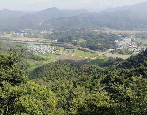 右侧为福喜岩,介绍说岩壁上的岩石纹理正看为喜,倒看为福,但我却看不出来。眺望山下,可见一太极八卦田和葫芦形水塘。截图放大,旁边的村子叫南坑。如果是春季油菜花开时应该会更漂亮。10点41分,来到一处开阔之地,这里有栖真岩、忠烈岩和寿字岩。