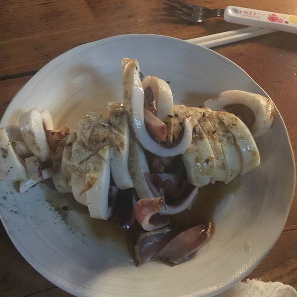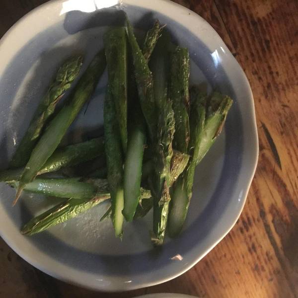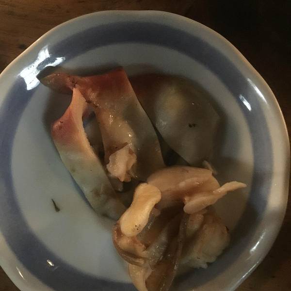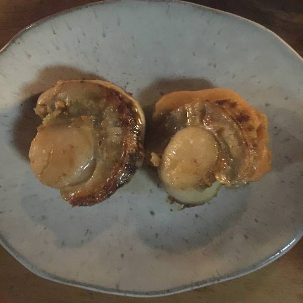 我旁边坐着两位大叔,因为实在距离太近,就边吃边听他们聊天。他们是店里的老客,这次还特意给老奶奶带了礼物来表示感谢,老奶奶跟他们寒暄了几句,说每天低头烤东西,自己的腰非常不好,很辛苦。确实,老奶奶背已经快驼成九十度了。我一个人点了好多,烤扇贝,烤土豆,烤鱿鱼,烤芦笋等等等等,比人家两个人吃的还多。。。