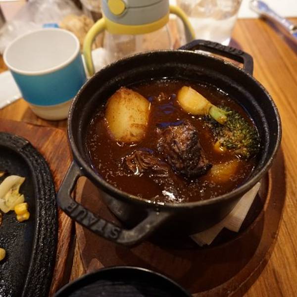 坐电梯到9层,一出来就能看到みのる食堂,落地玻璃窗外就是銀座中央通,用餐环境很好,有很多当地的家庭来这里。问了Samon饿不饿,坐了半天的飞机,跟着我们东奔西走,小家伙状态还不错。我们点了铁板汉堡包mix烤肠、铁板鸡还有炖牛腩配米饭,可能大家都饿了,很快扫光光。
