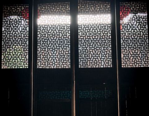 崇仁镇的戏台,周边廊下门窗有精致的雕刻,被损毁不少,也被保护了一点下来。 下图的复合六边形的门窗格只使用了榫卯结构固定。据当地居民介绍,在尝试修复中,断了一片,不经意间整体就会散架,很费工料的工法。