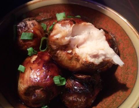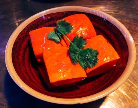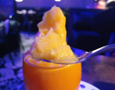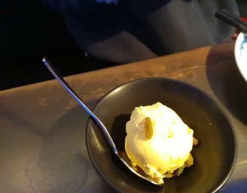 恒隆里两家吃鱼的店紧挨着 想带父母吃浓香烤鱼就来了这一家 菜单非常清楚的画出可选鱼的形状 标注了净重 有19种口味可以选择(太难取舍了 都好吃) 这次选了店家推荐 不辣的 蒜香味 鱼选择了湄公鱼 肉厚刺少 并非活鱼现杀 鱼肉经过腌制部分呈粉色 味道渗入鱼肉中了 选择了三种配菜 豆腐 时蔬(小白菜)藕片 想自己控制加菜的顺序 上菜时没让铺提前在下面 暴露了菜量小 菜不够新鲜 切出的菜明显沾了其他菜品碎屑的缺点 甜品选了黄金瓜 就是蜜酿南瓜块(热的) 桌桌必点的芒果冰沙比较实惠了 和外婆家餐饮属于同一企业 店内装修地板餐具风格都非常相似 美中不足的就是这个装修风格和昏暗的室内灯光 不容易看清菜品本身的颜色