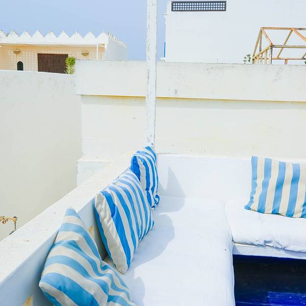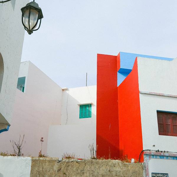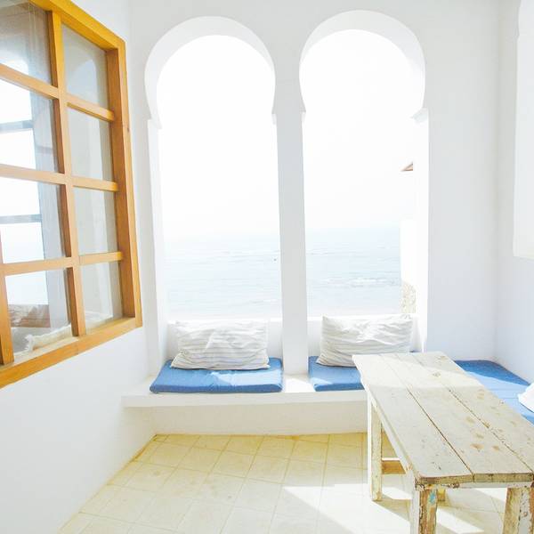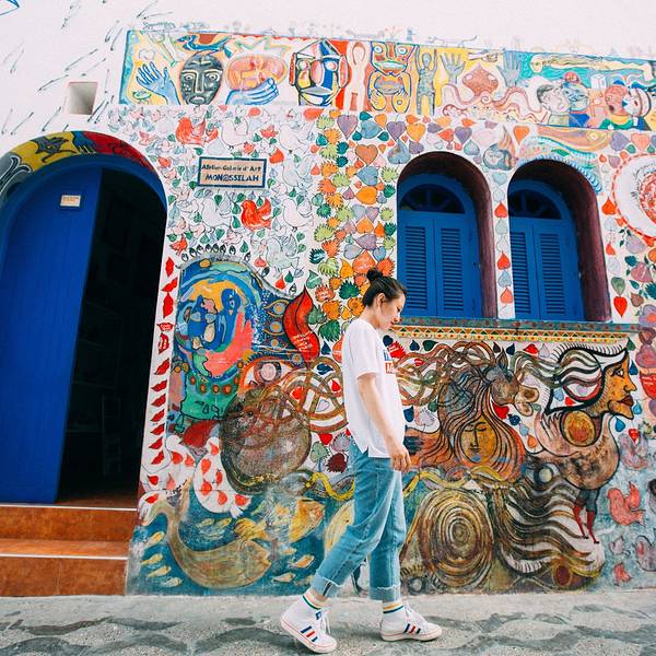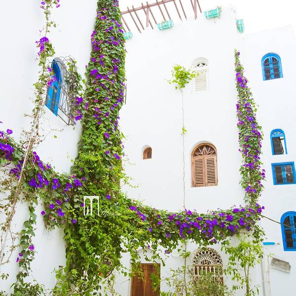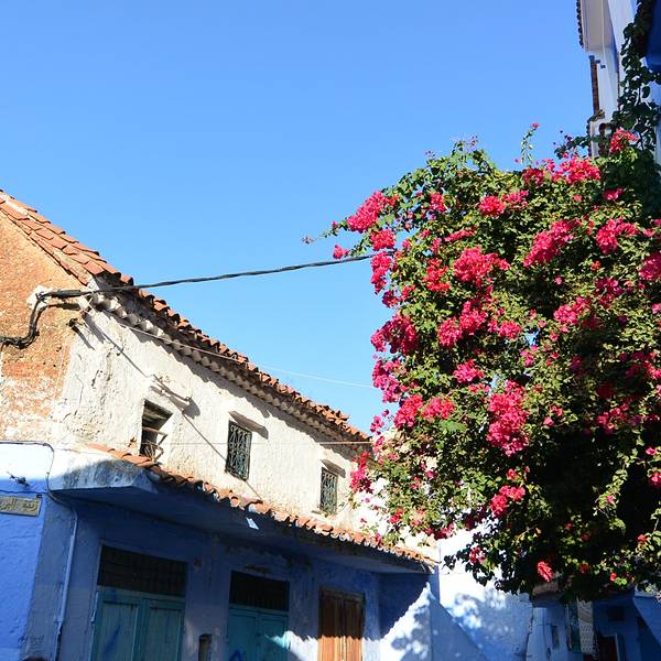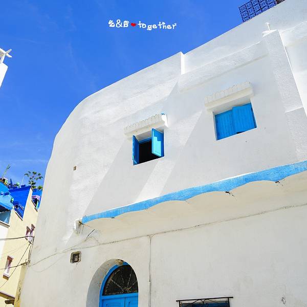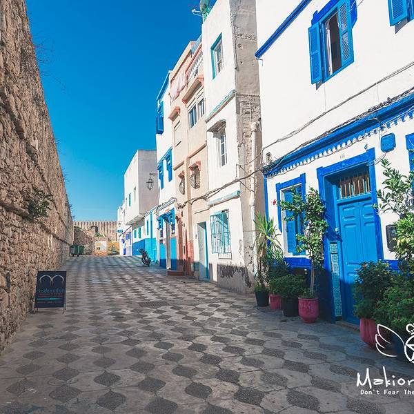 冲着壁画来的,这medina里到处都是壁画,认真一看你会发现大多数壁画都是2016年才画的,我猜啊这壁画小镇的称号应该也不是很久的事情。听别人说,这里的壁画更新速度蛮快的,也确实还能看见有艺术家在作画,看来确实艺术气息满满啊。除了壁画,这里的门也给我留下了很深刻的印象,几乎每家每户的门都不一样,还有鲜花装饰在旁,虽然这里比舍夫沙万小得多,可浪漫的气氛却能和舍夫沙万拼一拼。在蓝白之外,你还能在这里遇见粉色、紫色、咖啡色等等可爱的颜色,少女心一下子就被激发了哈哈~虽然错过了前一天极致的晚霞,可第二天的阳光我们可没落下,蓝天配海洋,加上海边的白色房子,简直可以伪装成我心目中一直向往的圣托里尼了。