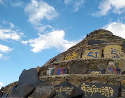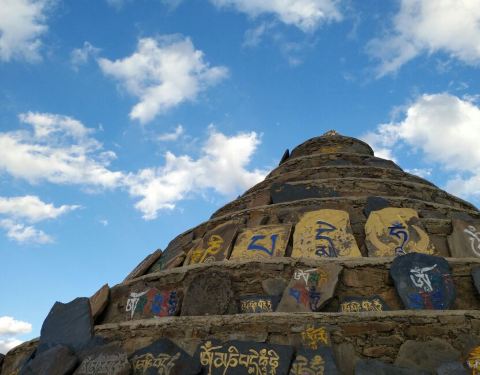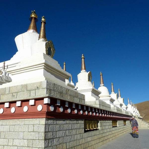 在稻城的最后一天游玩。 是甘孜洲最大的白塔,由一个主塔和108个小塔组成,也是稻城的门户之一。很多藏民来到白塔转经,绕行三圈,每当经过主塔的前面,双手合十,低头顶礼,十分庄重。尊胜塔林在蓝天的映衬下,显得无比圣洁肃穆